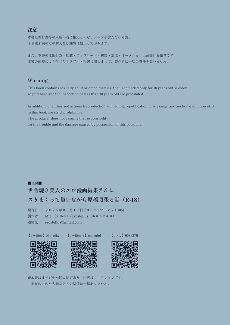 (C106) [Erostellus (Miel)] 世話焼き美人のエロ漫画編集さんにヌきまくって貰いながら原稿頑張る話 (オリジナル) [DL版] 2025 11/11 エロマンガ 2025年11月11日 エロマンガ URLをコピーしました! オススメ作品 年下のゆるふわで巨乳な幼なじみと恋もエッチも独り占め 2025年12月1日 悪魔と同棲はじめました 2025年12月1日 100日後に妊娠するOLさん! 2025年12月1日 もう人妻なのに元同級生3人から強●懇願セックスさせられる 2025年12月1日 しょんべん 給水係 2025年12月1日 クラスの憧れの巨乳JKと種付けセックスする話 2025年12月1日 爆乳ギャルのカクシゴト 2025年12月1日 寝取られ彼氏持ちむっつりスケベちゃん 2025年11月30日 コメント コメントする コメントをキャンセルコメント ※ 名前 ※ メール ※ サイト 次回のコメントで使用するためブラウザーに自分の名前、メールアドレス、サイトを保存する。