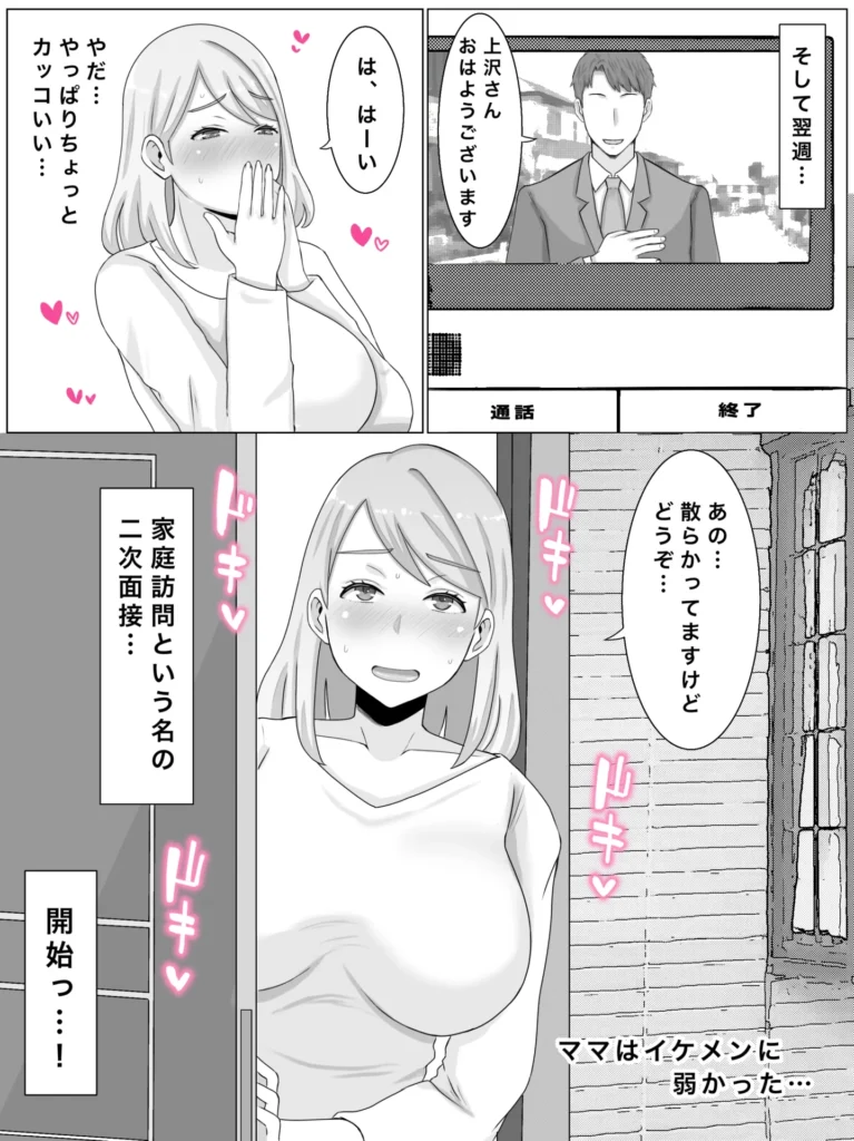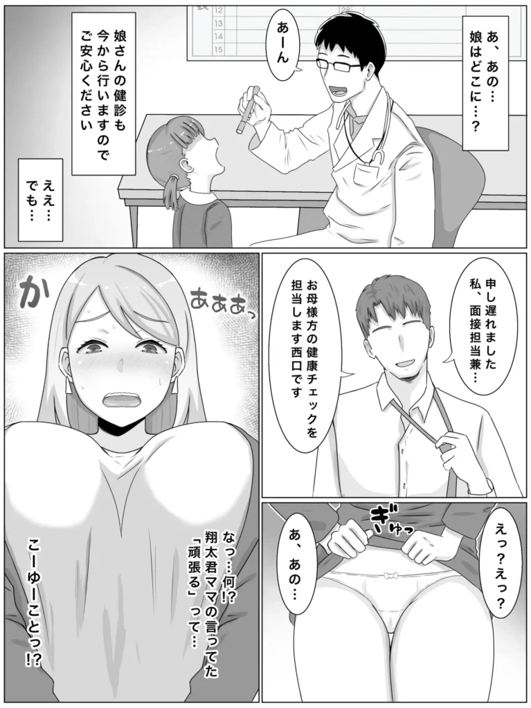 娘のお受験面接で学校に赴いた巨乳ママ。若い男性教員との和やかな雰囲気で進む面接に「何だ、楽勝じゃん♪」と思っていたのもつかの間…。「お母様の健康チェック」と称して大事な場所まで確認されたあげく、その場で男性教員と体の相性まで確認されてしまう。それでも巨乳ママは娘の将来のため、男性教員との淫らな面接を続けてしまう。最後は男性教員との子を孕んでしまい、自らの欲望に逆らえず許されない関係を継続してしまうのだった…。(ボテ腹エッチあり)若い男性教員に溺れていってしまう巨乳ママのNTR作品です。