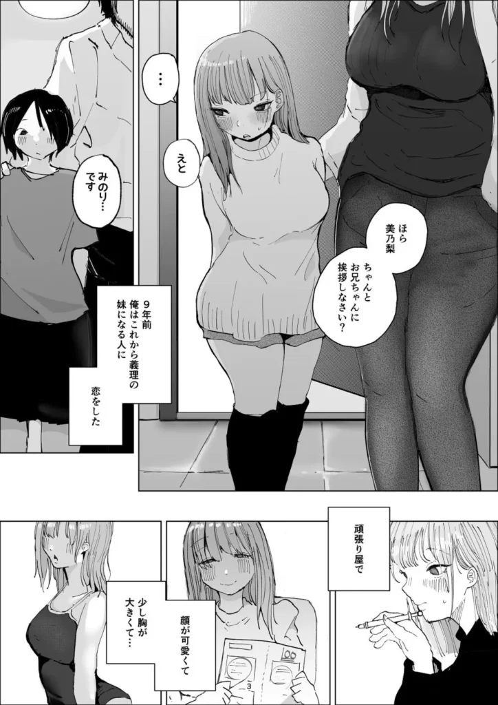 【あらすじ】9年前、俺はこれから義理の妹になる人に恋をした。義妹の成長に、思わず目線のやり場に困ってしまう兄。しかし、素知らぬ顔の妹も実は、昔からお兄ちゃんのことが「大好き」で…?一度通じ合った二人は、肉欲のままに愛し合い混ざり合い、やがて、大人になっていく…。