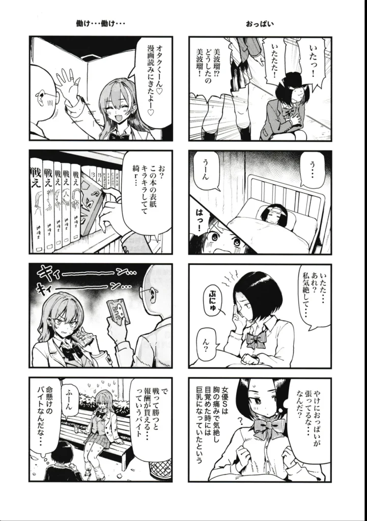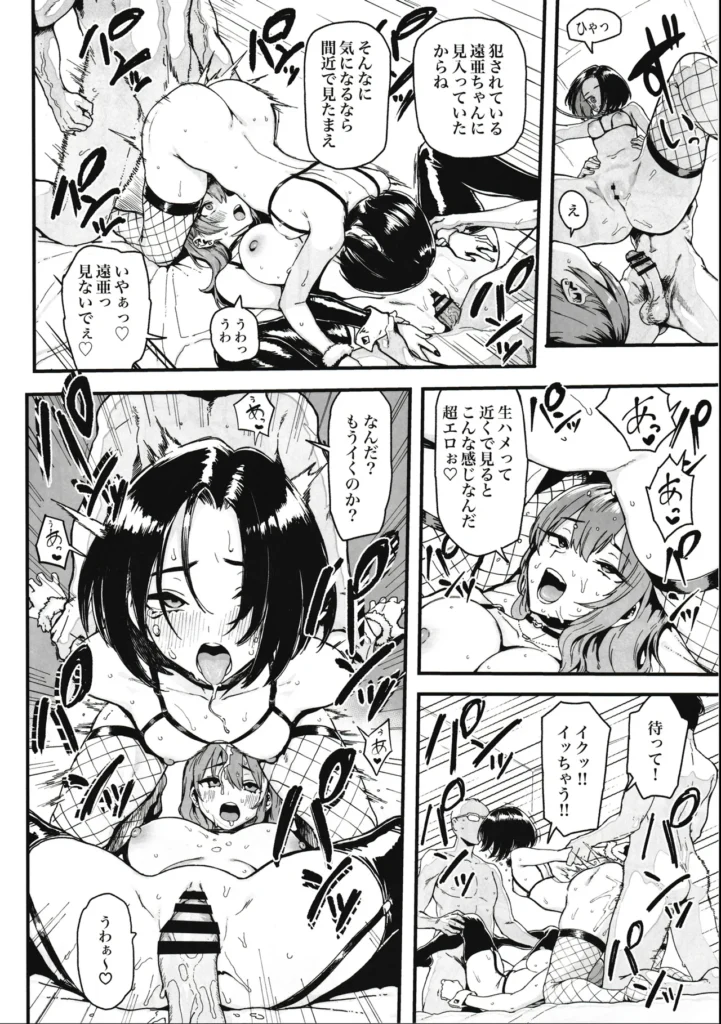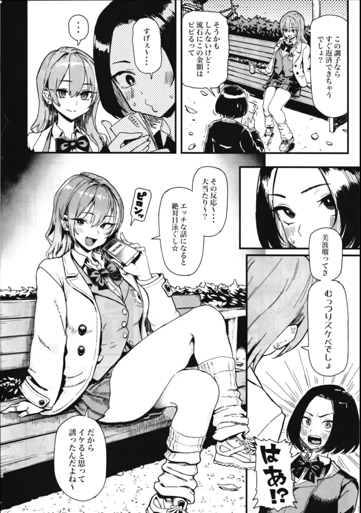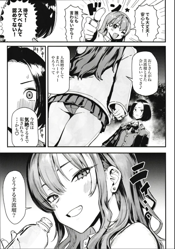 根明のギャル「須藤遠亜」とクールなJK「新井美波瑠」がおじさん相手にお小遣い稼ぎをする漫画です。遠亜がおじさん相手に体を売って稼いる中、美波瑠は家の家賃を滞納し母娘共に大ピンチ。そんな美波瑠から相談を受けて二人一緒にお小遣い稼ぎを始めるが・・・中出し、パイズリ、フェラチオ、イラマチオあります。