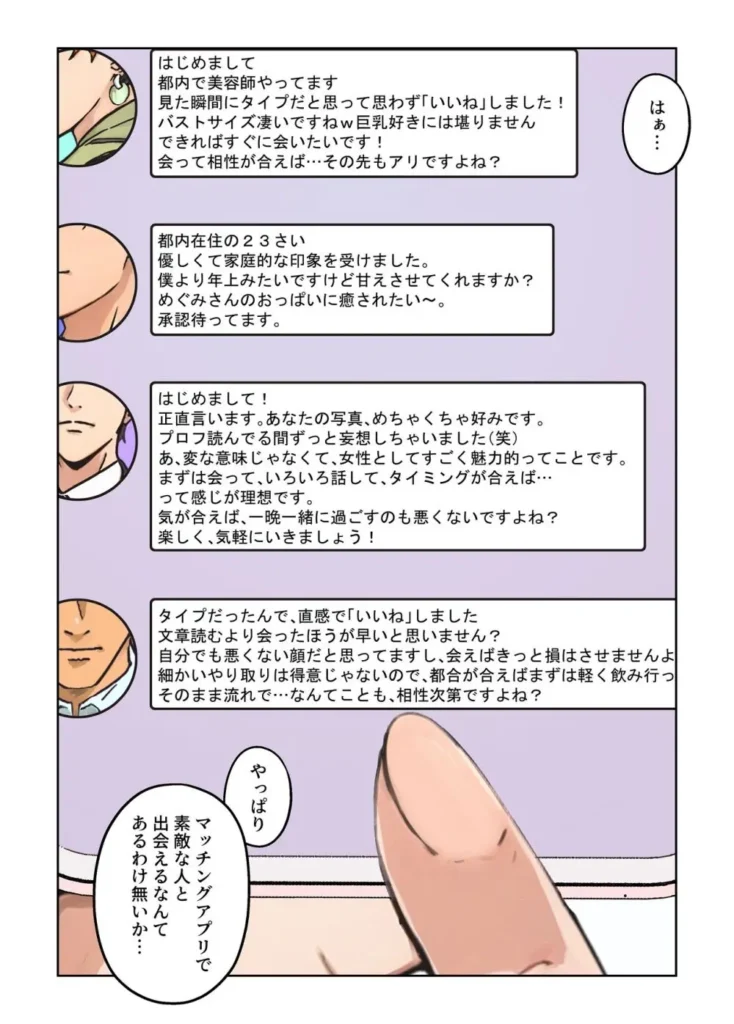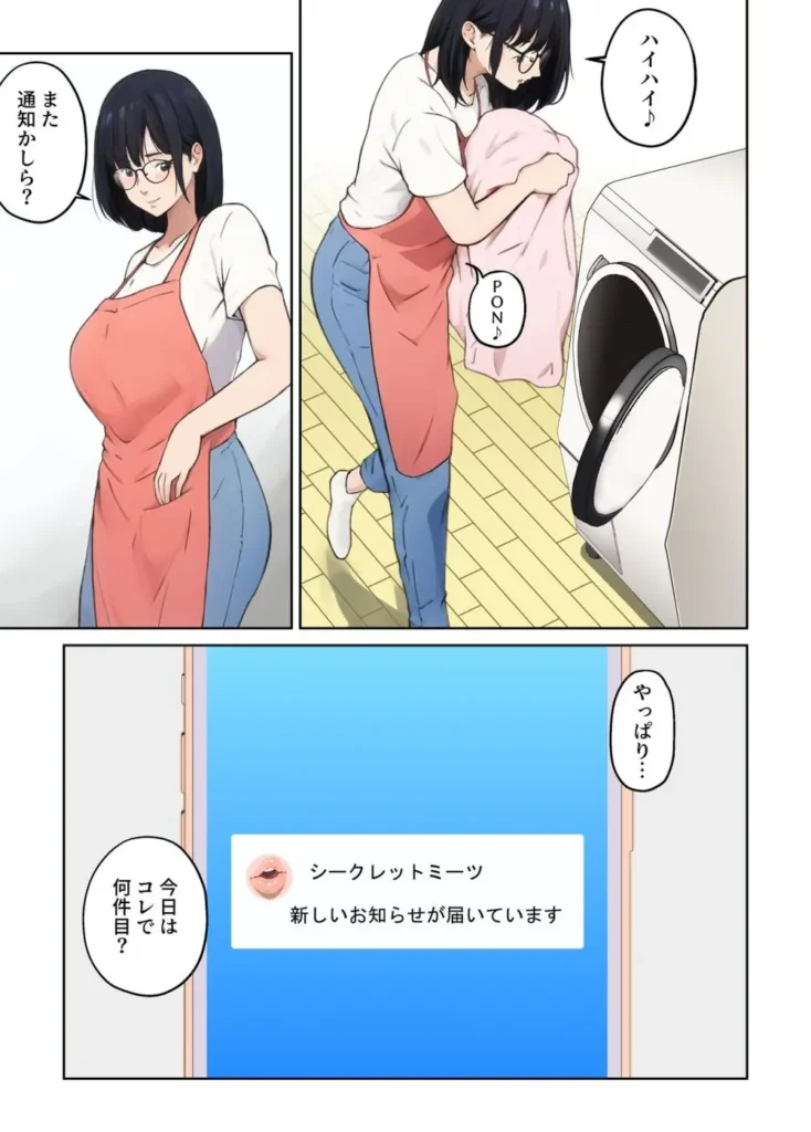 ■あらすじ ‘平凡な毎日’に飽きていませんか? 平日の午後、あなたのスマホの中だけで、 少しだけ秘密の扉を開けてみませんか? 〇家庭や名前は明かさなくてもOK 〇今だけ、20〜40代女性の登録者数が急増中 〇安心・安全のサポート体制 【既婚者限定】のマッチングアプリ ちょっとだけ非日常。 あなたが忘れかけていた「女の顔」が、 ここで目を覚まします。 →《匿名&無料ではじめる》 ── 大人の出会い専門【シークレットミーツ】 都内在住の平凡な主婦ーめぐみのスマホに届いたメッセージ。 いつもならスパムメッセなんて削除してるのに寂しさの余りサイトを開いてしまう。